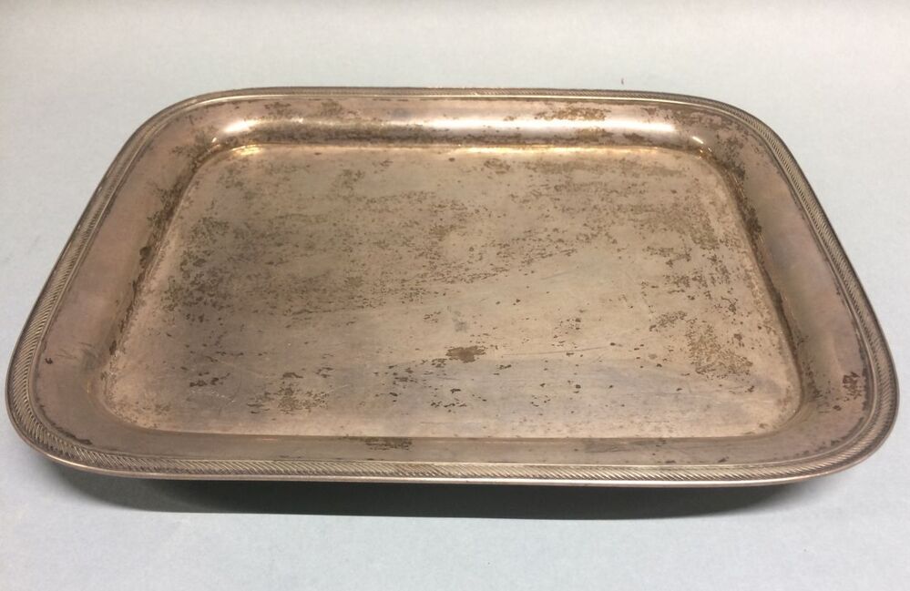 Zilveren presenteerblad waarvan de rand is bovenop versierd met een kabelband tussen twee gladde profielen