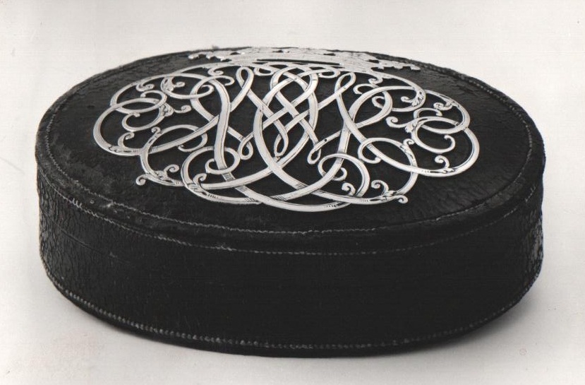 Tabaksdoos bekleed met leer met bovenop deksel gekroond monogram M.C.v.S. in zilver