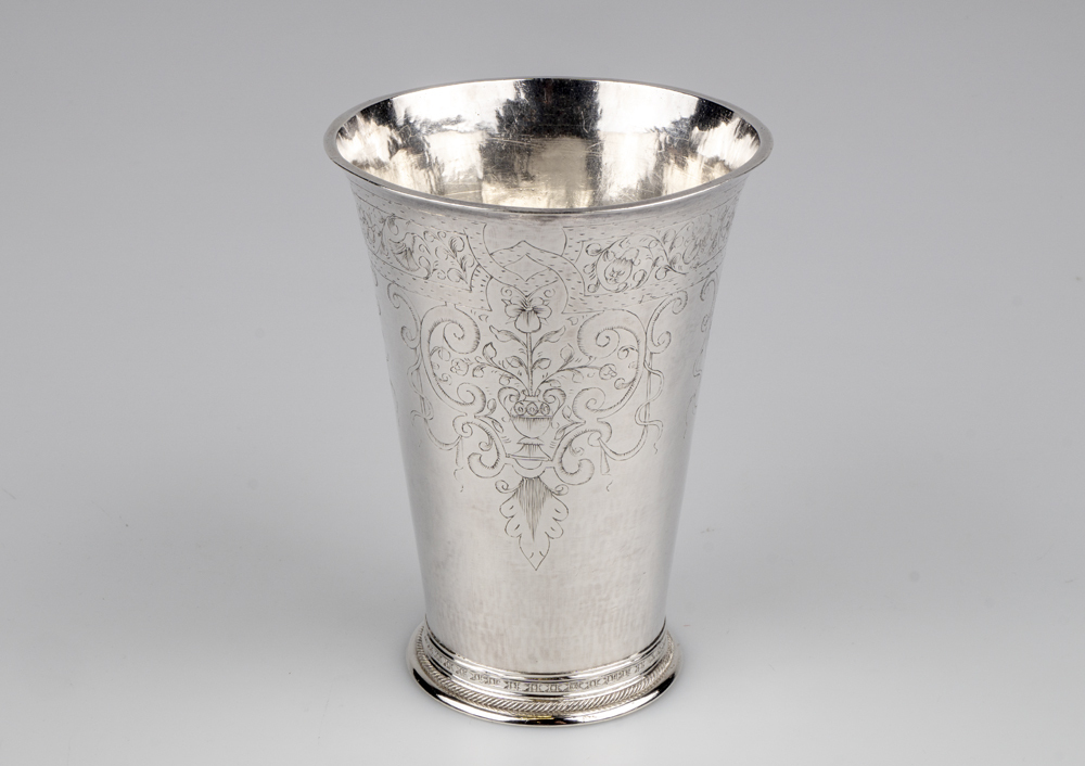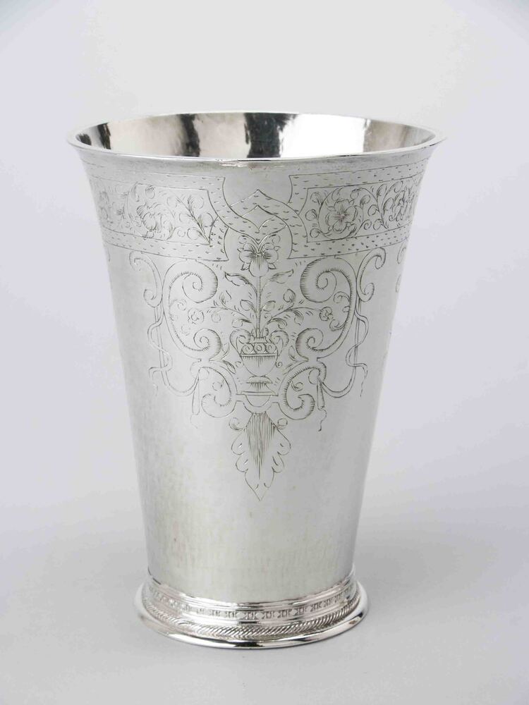 Beker versierd met vazen met twee oren, waarin een rechtopstaande viool en symmetrisch twee neerbuigende tulpen, omgeven door voluten en linten, op de bodem de namen Benne Tamminga en Trintie Tiepkes
