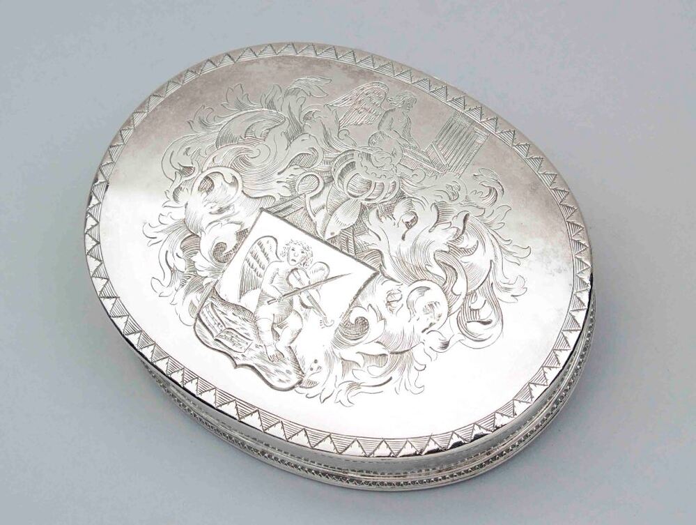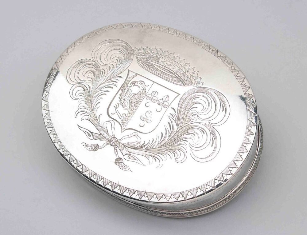 Tabaksdoos met gekroond wapen op deksel omlijst door twee bladranken