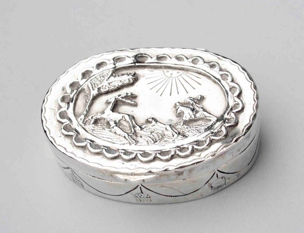 Doosje met op het deksel is een ovaal, geschulpt medaillon geappliqueerd waarin een hertejacht