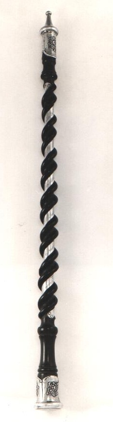Ebbenhouten dirigeerstok met op het handvat en op de bloem groepjes van 2 à 3 bloemen met enkele bladeren op gegranuleerde grond