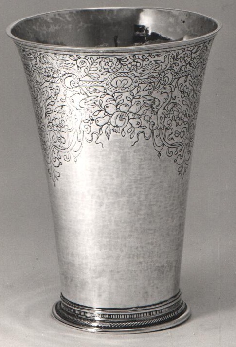 Beker met medaillons met hiertussen symmetrische boeketten, omgeven door griffioenen