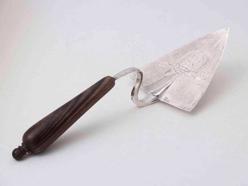 Een zilveren of verzilverde troffel is het ceremonieel metselgereedschap dat wordt gebruikt bij een eerste steenlegging. Een inscriptie op het blad verhaalt over de feestelijke gebeurtenis. https://data.cultureelerfgoed.nl/term/id/cht/5c199c82-f01f-467f-a8ec-0a1216554ac6