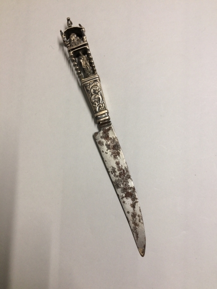 Mes met zilveren heft met voorstellingen van Matthias en de Zondeval