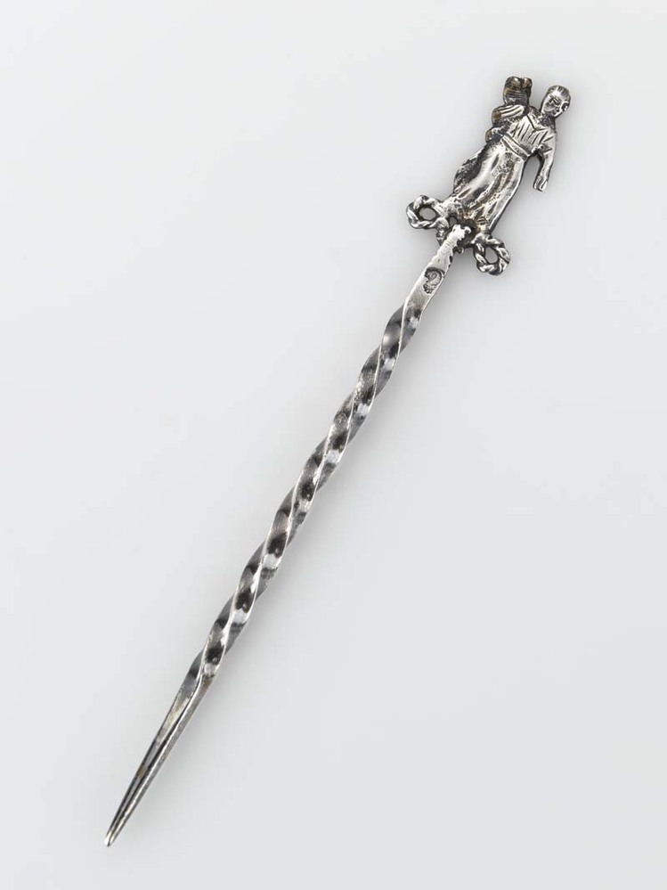Pijpenpluizer met man in lang gewaad, staand op achtvormige, getorste lus, met zijn rechterarm voorwerp op zijn rug houdend