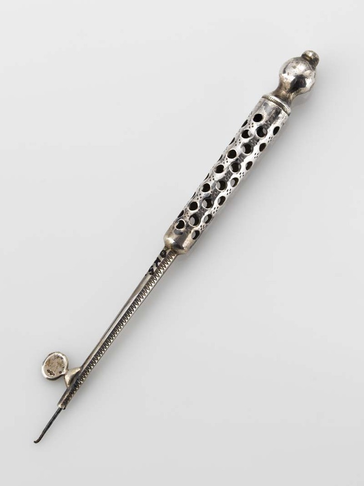 Zilveren houder voor haaknaald waarvan het handvat voorzien van gaatjes en op de top een knopje