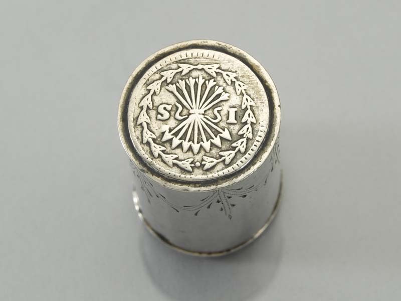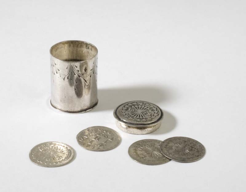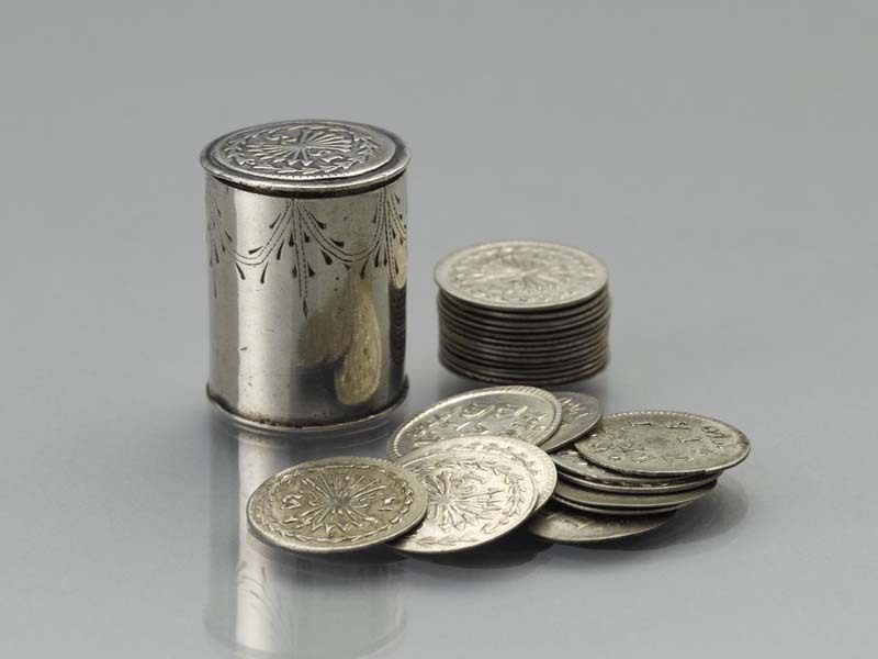 Muntendoosje met 26 munten met op deksel muntje met bundel van zeven pijltjes met ter weerszijden 1S