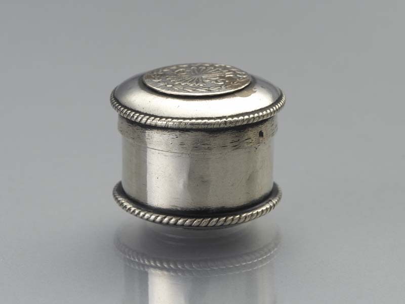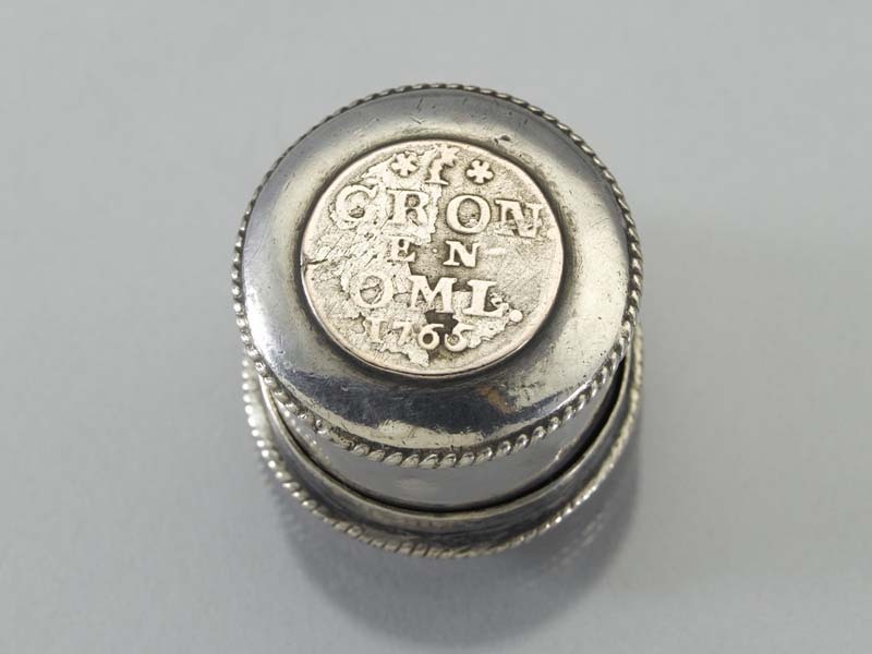 Muntendoosje met op deksel Westfries bezemstuivertje bundel van 7 pijlen met ter weerszijden IS