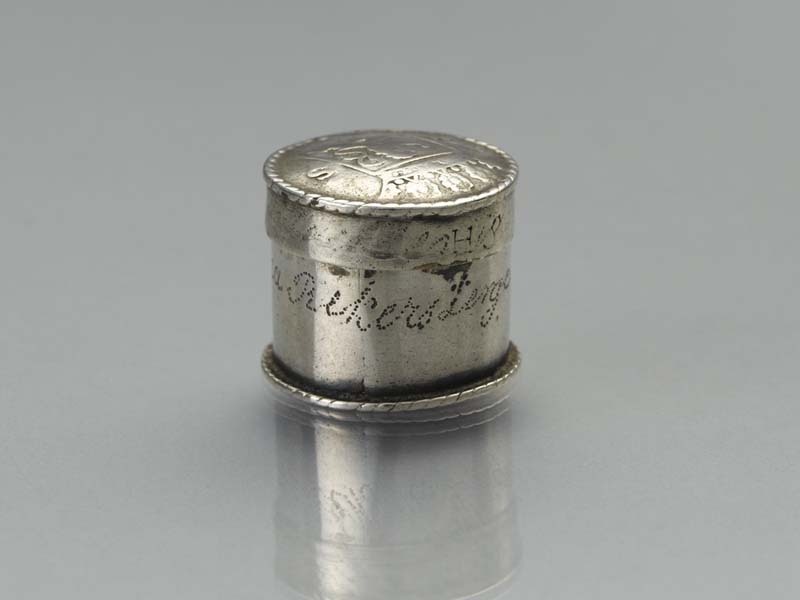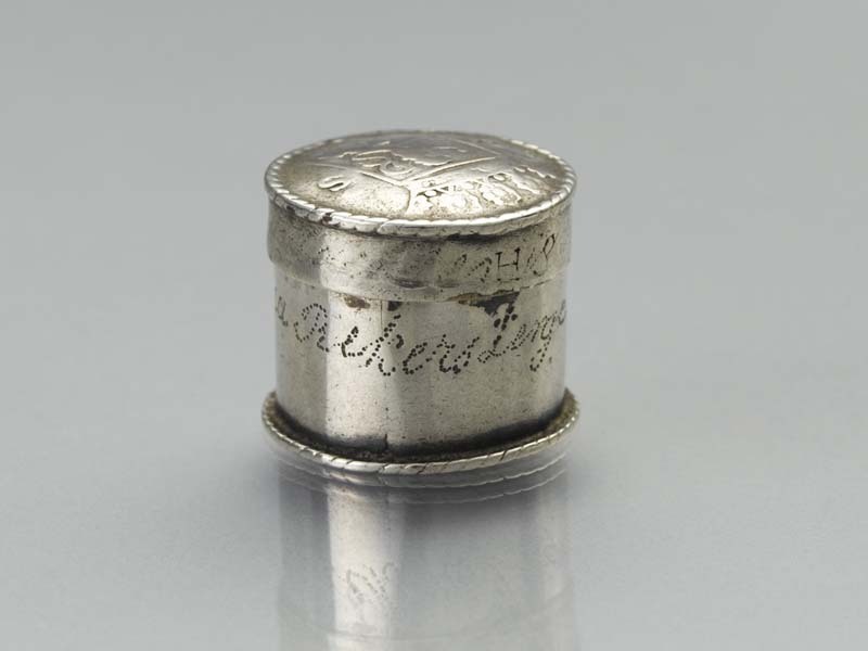 Muntendoosje met op sluitring in drukletters HS en sporen van inscriptie