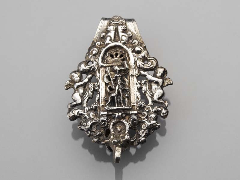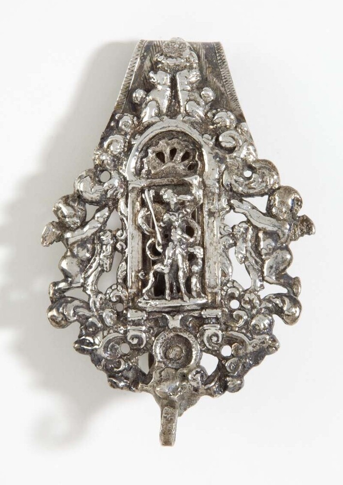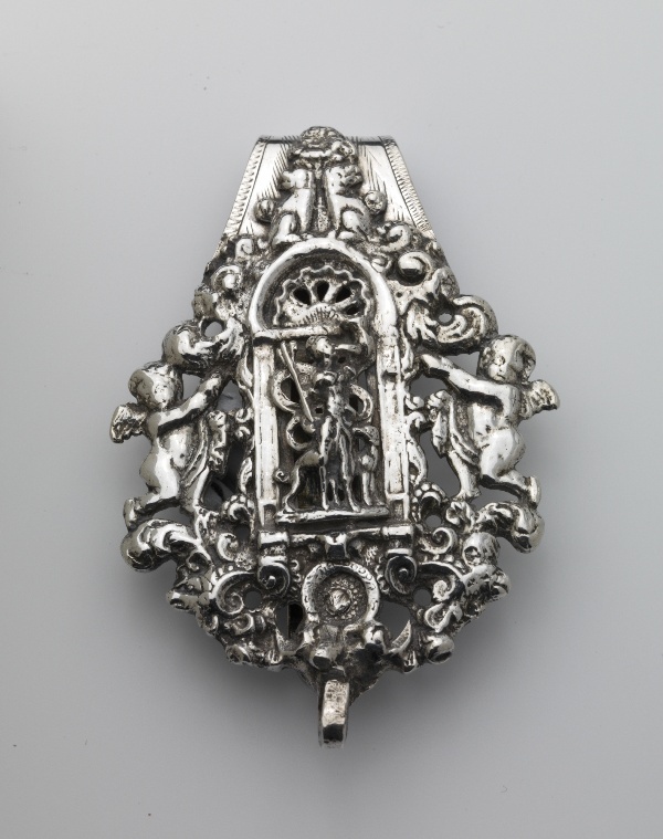 Gegoten zilveren beugeltashaak met de godin van de jacht Diana