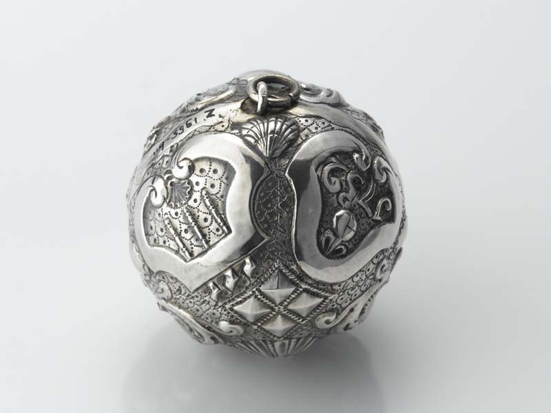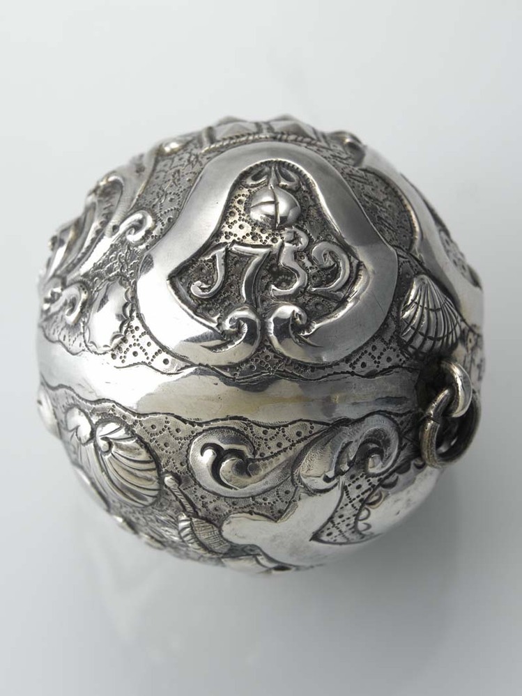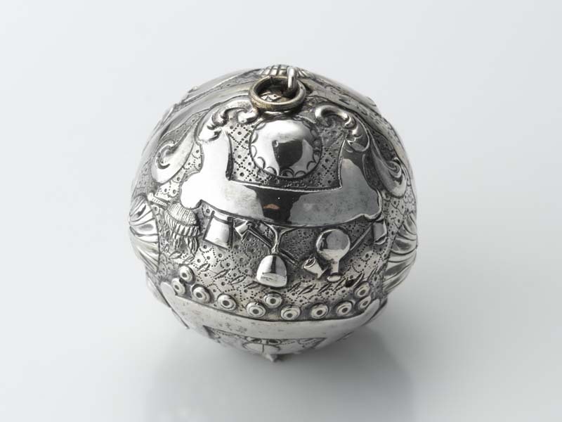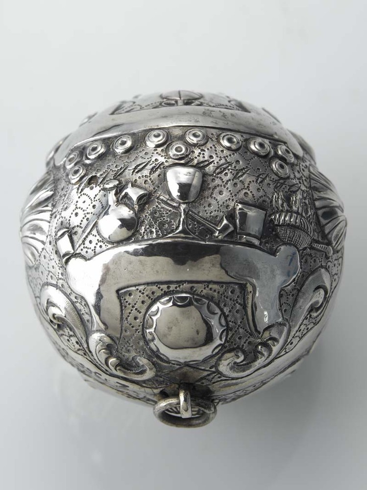 Zilveren kolfbal met oog om aan op te hangen en de afbeelding o.a. drie kolfstokken, 1752