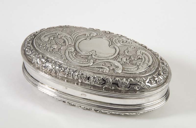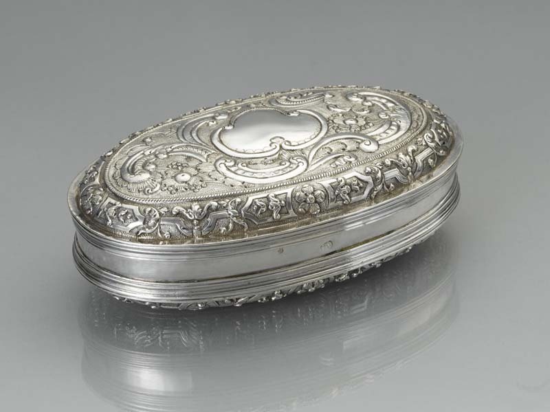 Tabaksdoos met op gergranuleerde grond, bandwerk, culots, vijfbladige bloemen en rankjes