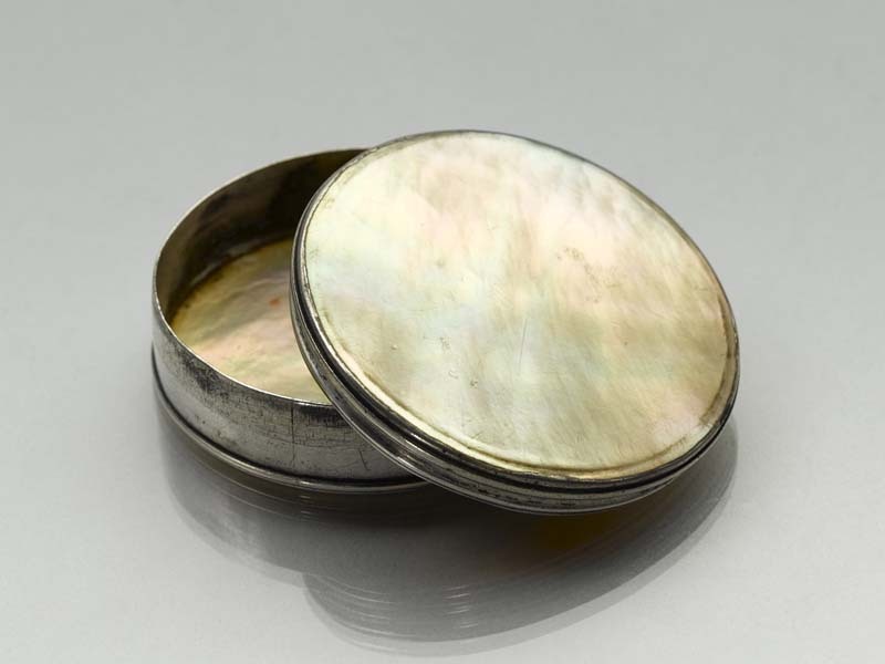 Doosje rond, plat, laag doosje met bodem en deksel van parelmoer in zilver gezet