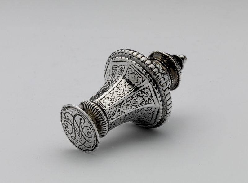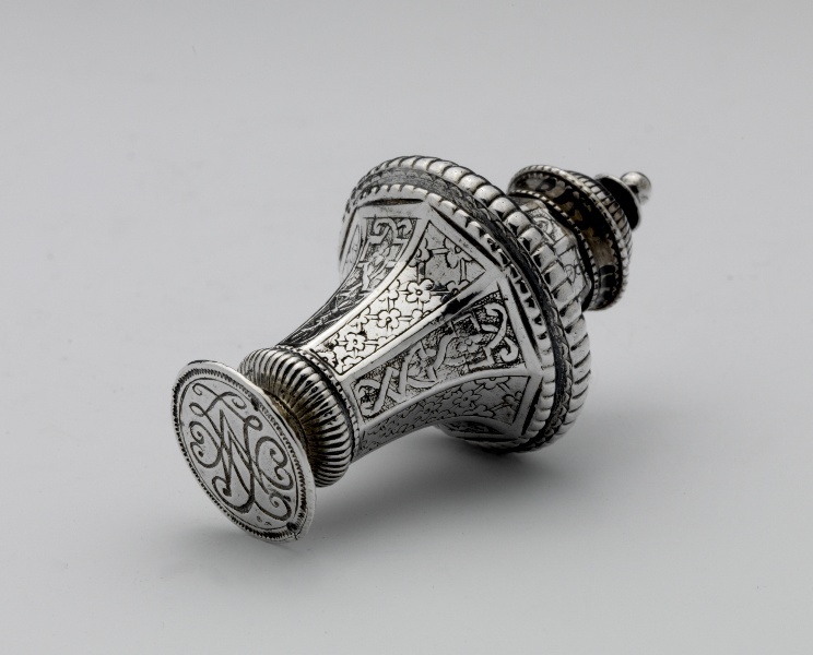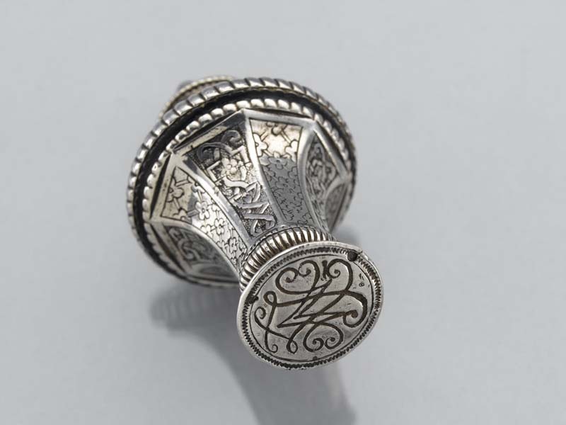 Zegelstempel met spiegelmonogram MVL en zandstrooier in vorm van tuinvaas