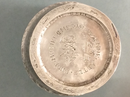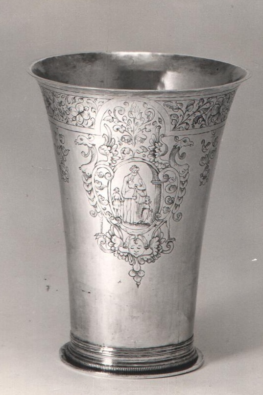Huwelijksbeker met alliantiewapens en grote cartouches met allegorieën van Geloof, Hoop en Liefde