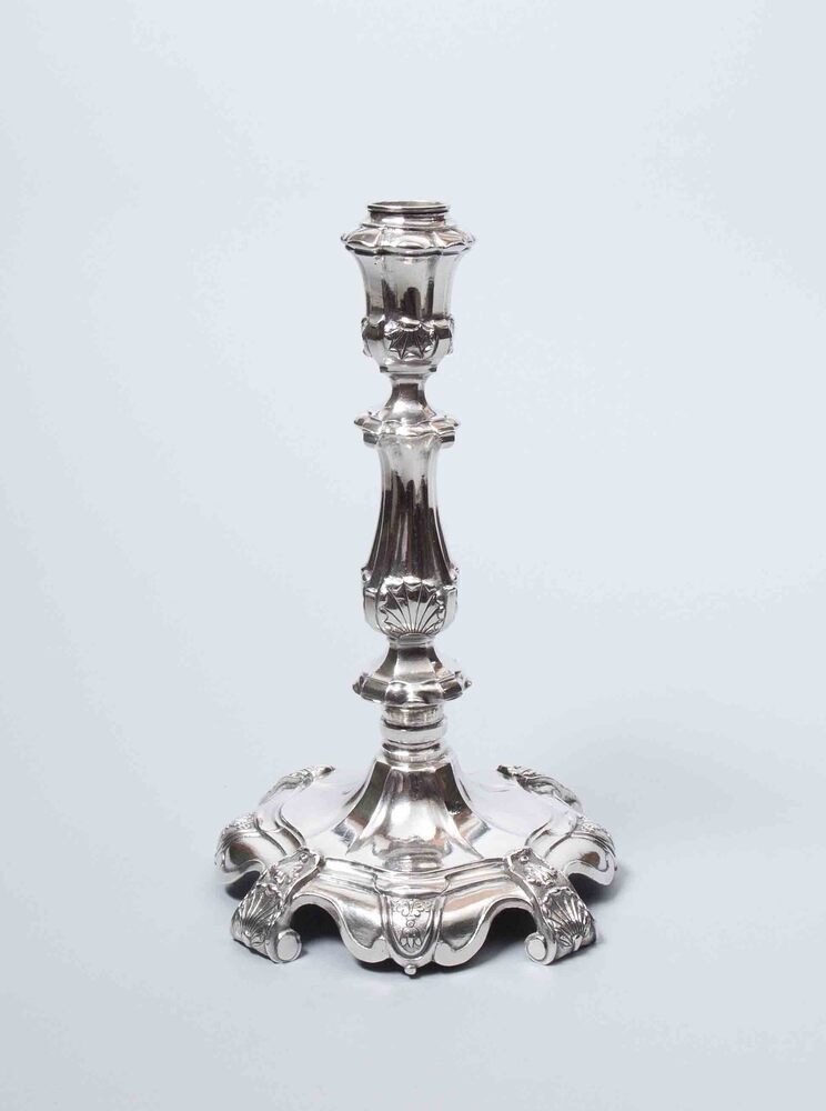 Een van twee zilveren kandelaars versierd met culots en palmetten
