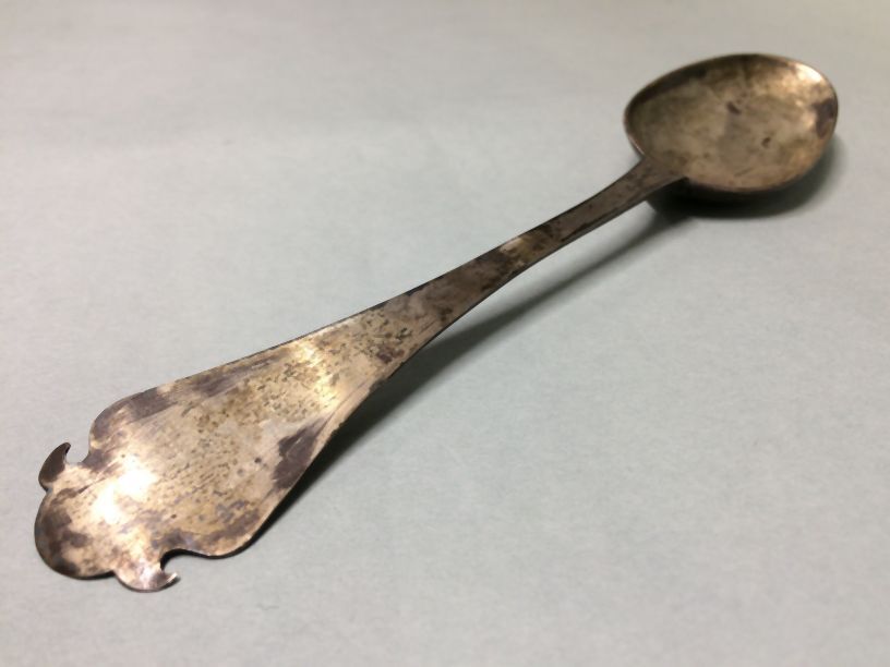 Lepel met smalle steel die naar boven toe breder uitloopt en afgewerkt is met een pied de biche