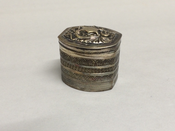 Zilveren loddereindoosje met op het deksel gestampte versiering van krullen