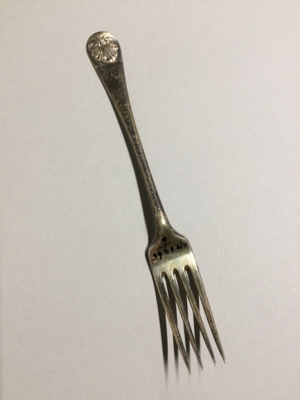 Dessertvork met St. Jacobsschelp aan het lof en aan de top van de steel