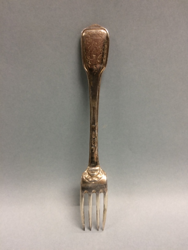 Een van negen zilveren vorken uit couverts met alliantiewapens Sixma en van Burmania onder een kroon
