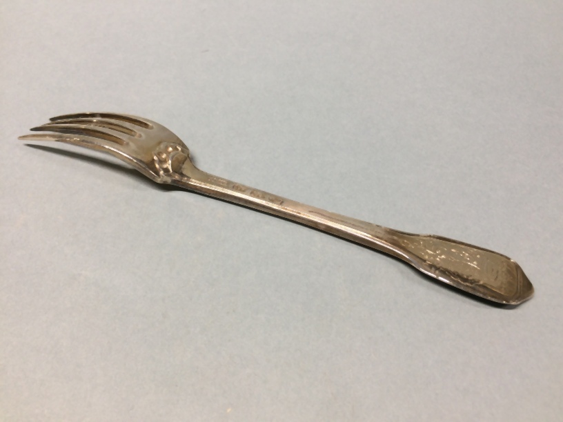 Een van negen zilveren vorken uit couverts met alliantiewapens Sixma en van Burmania onder een kroon