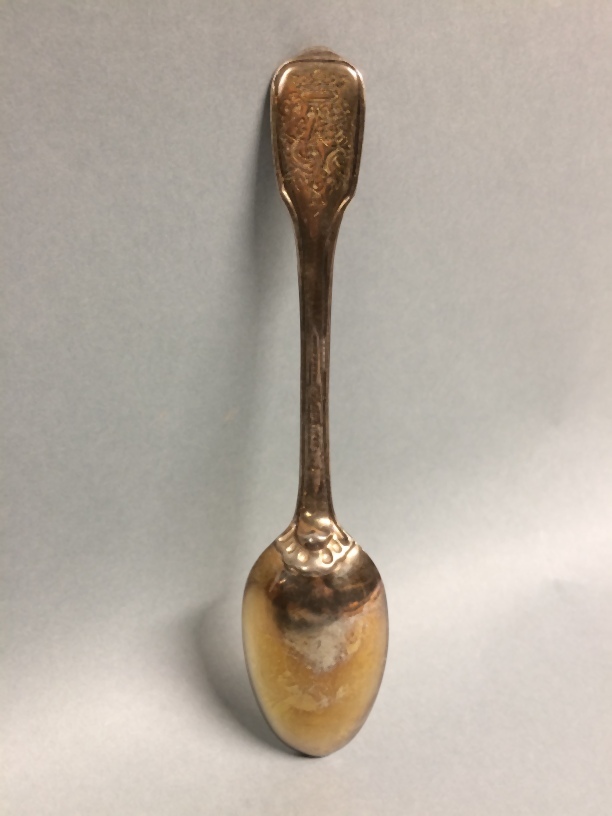 Lepel, onderdeel van elf zilveren lepels uit couverts met alliantiewapens Sixma en van Burmania onder een kroon