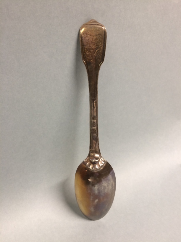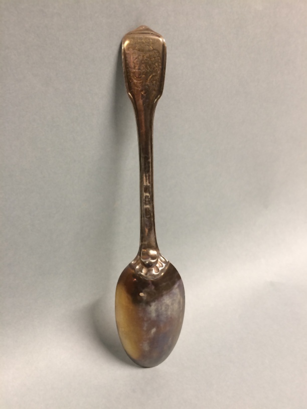 Lepel, onderdeel van elf zilveren lepels uit couverts met alliantiewapens Sixma en van Burmania onder een kroon