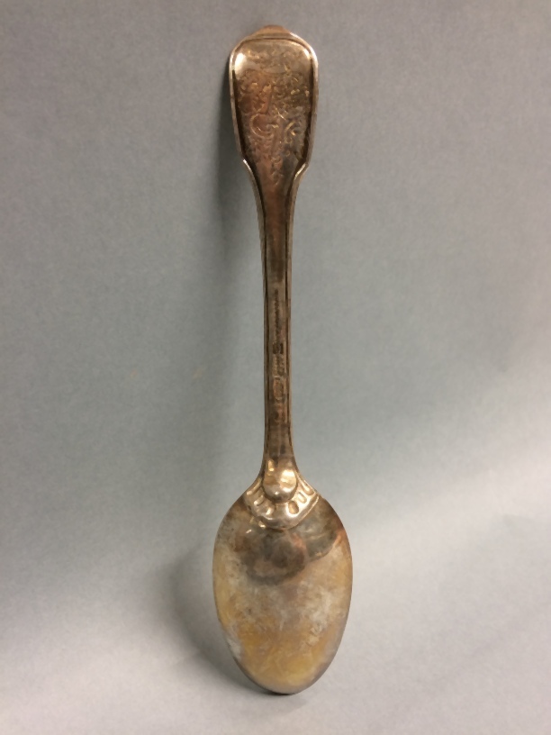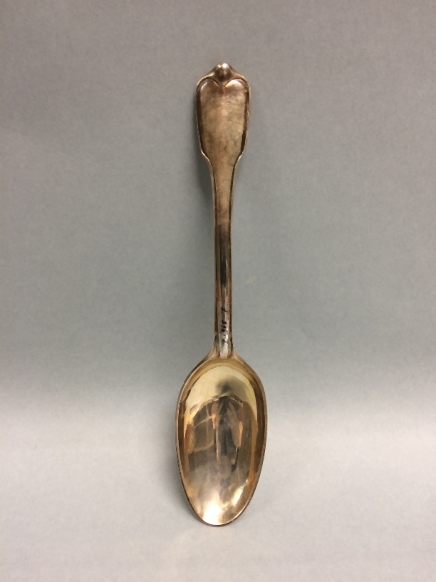 Lepel, onderdeel van elf zilveren lepels uit couverts met alliantiewapens Sixma en van Burmania onder een kroon