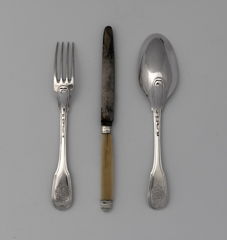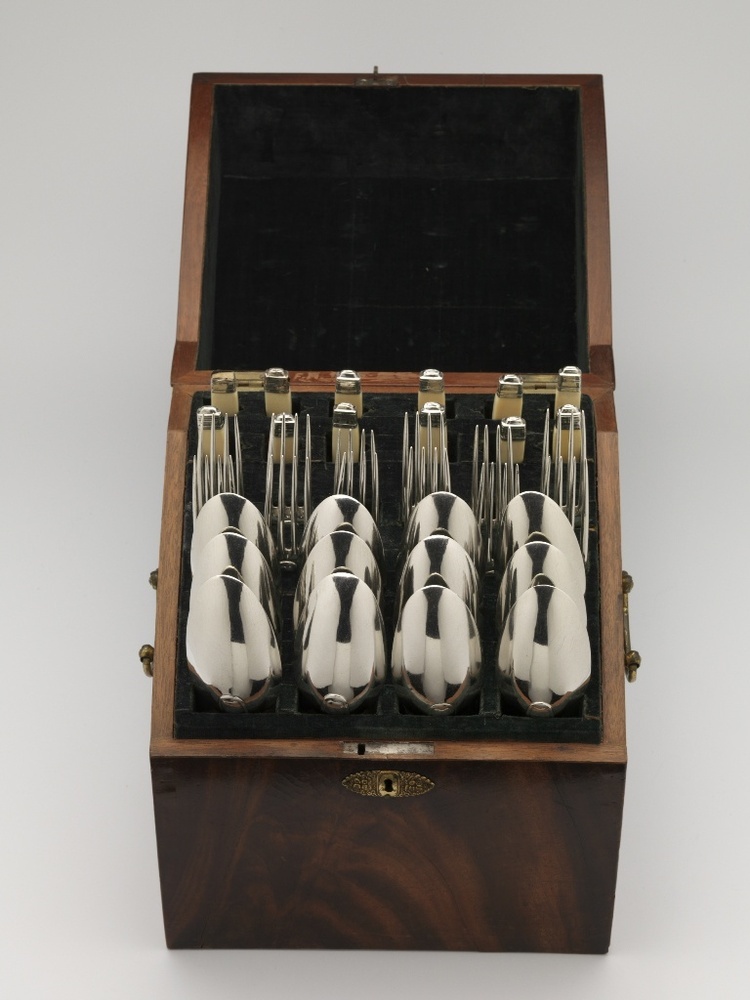Twaalf zilveren messen in mahoniehouten cassette met alliantiewapen Rengers-Van Welderen