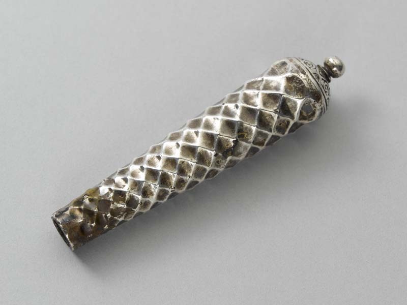 Mesheft met taps toelopend heft versierd met ruitvormig netwerk, de top wordt afgesloten met een gewelfd dekselvormige dop waarop een klein rond knopje