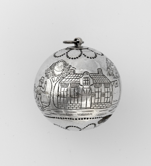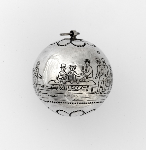 Zilveren kaatsbal met oog en ringetje om te kunnen hangen met gezicht op herberg en personen