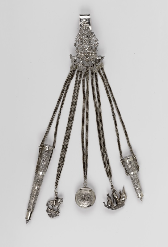 Sierkettingen, -spelden of knipsluitingen die meestal om de pols van een vrouw worden gedragen en waaraan bedeltjes, sleutels, buideltjes of andere voorwerpen aan zijn vastgemaakt. (AAT-Ned) https://data.cultureelerfgoed.nl/term/id/cht/0cfb8f2e-0132-43d7-a5ed-9aab256ad739