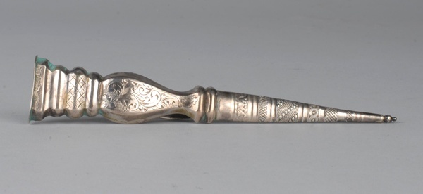 Zilveren breischede met op de achterzijde een haak gedateerd, waarop ingepunt: A.K.A. 1857