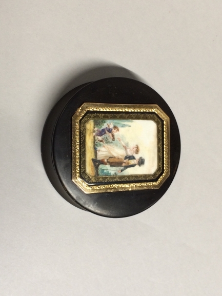 Rond doosje van schildpad met een emaille beschildering gevat in een gouden omlijsting