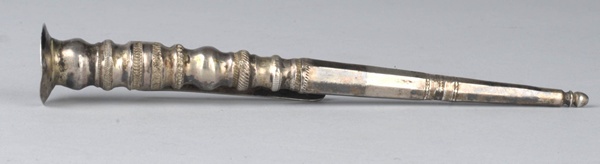 Zilveren breischede met op de achterkant een haak gesoldeerd, waarin ingepunt het opschrift: PNB.