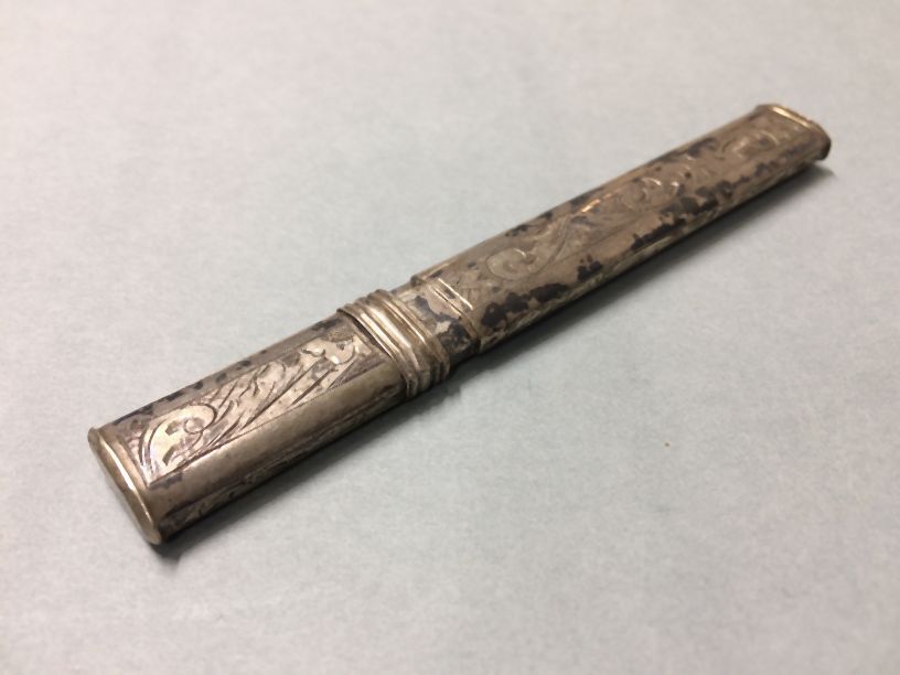 Langwerpige koker of bus om naalden in te bewaren. (ABR) https://data.cultureelerfgoed.nl/term/id/cht/42612500-385a-4753-ac83-ba412334f512
