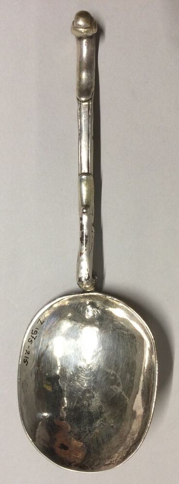 Lepel met met ovaal blad en steel bestaande uit kwabornament, bovenaan een bloemknop