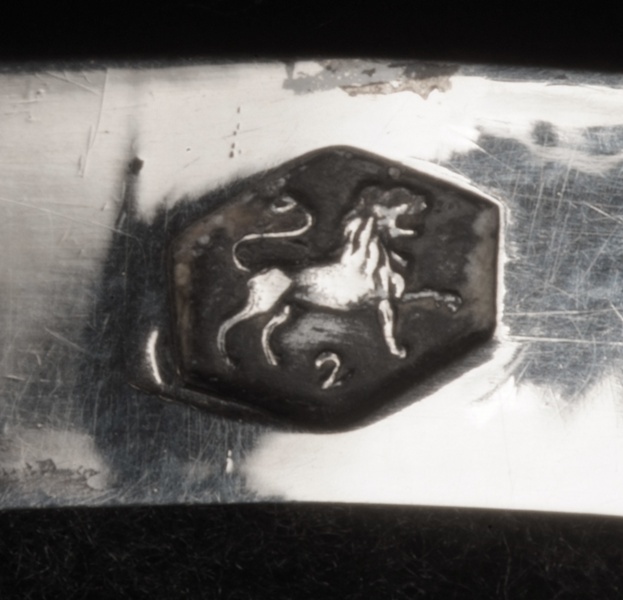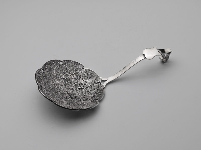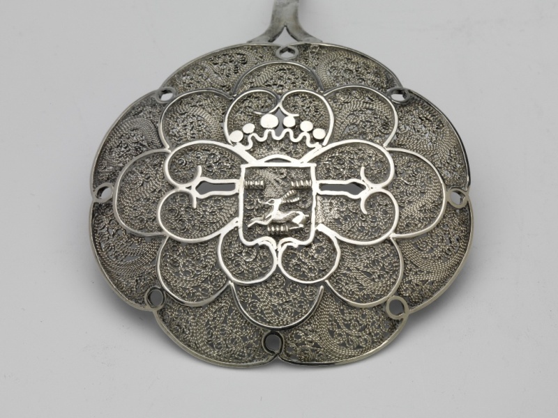 Suikerstrooier in de vorm van een geschulpt blad met wapen Van Cammingha