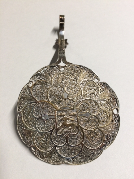 Suikerstrooier in de vorm van een geschulpt blad met wapen Van Cammingha