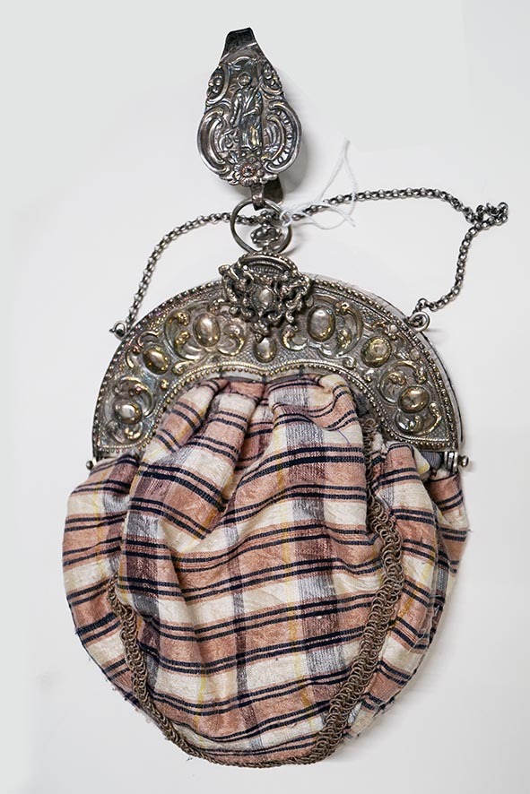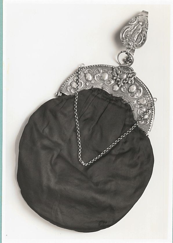 Zwart zijden tas met zilveren beugel, de zijden tas is vervangen door een gestreepte replica