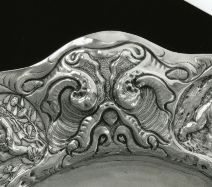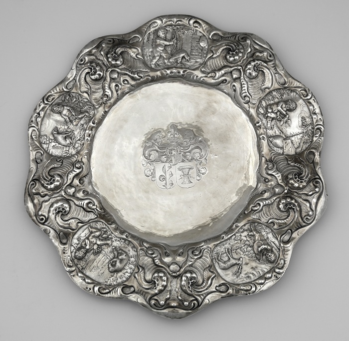 Schotel met de vijf zintuigen en het alliantiewapen Fockens-Aytta