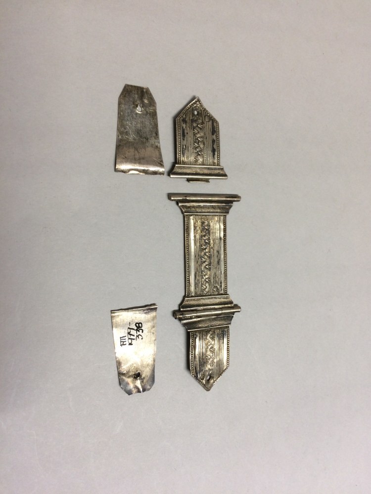 Het geheel van (edel)metalen, geornamenteerde bescherm- en/of versierstukken op kostbare boeken. De delen (kunnen) zijn: de hoeken, een centraal middendeel, klamphouders en klampen en een houder met ring middenboven voor een draag- of vergrendelingsketting.