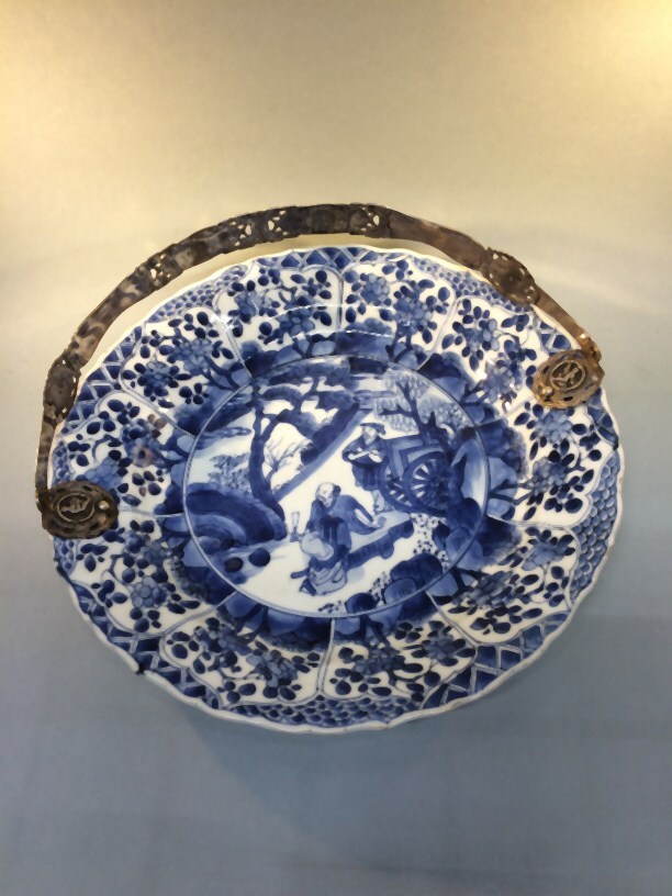 Blauw chinees porseleinen schotel met zilveren hengsel en opschrift I.L.K.