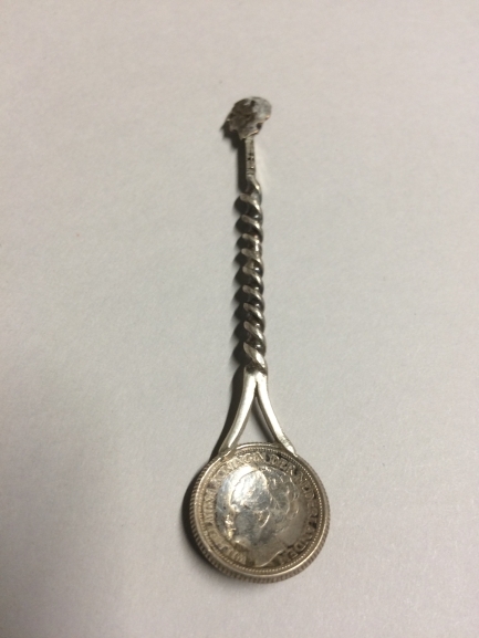 Collectie zilveren theelepeltjes, waarin munten verwerkt zijn