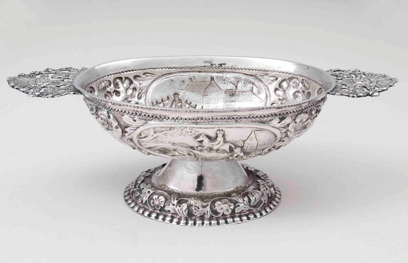 Zilveren brandewijnkom met gedreven voorstellingen van een marskramer en een ruiter