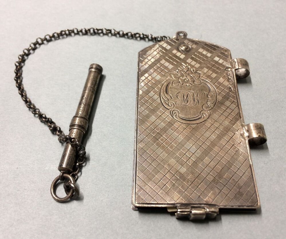 Langwerpig balboekje van zilver met ingegraveerd ruitpatroon en cartouche met de letters D W