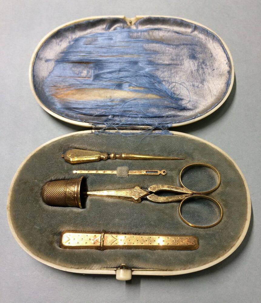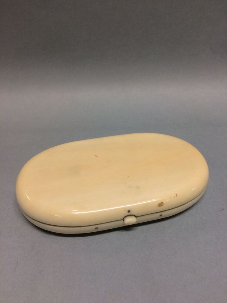 Gouden handwerkgarnituur in platte ovale ivoren doos