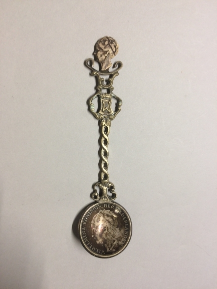 Lepeltje bestaand uit de bak van een zilveren rijksdaalder uit 1930 en op de top een uitgezaagd portret van koningin Wilhelmina