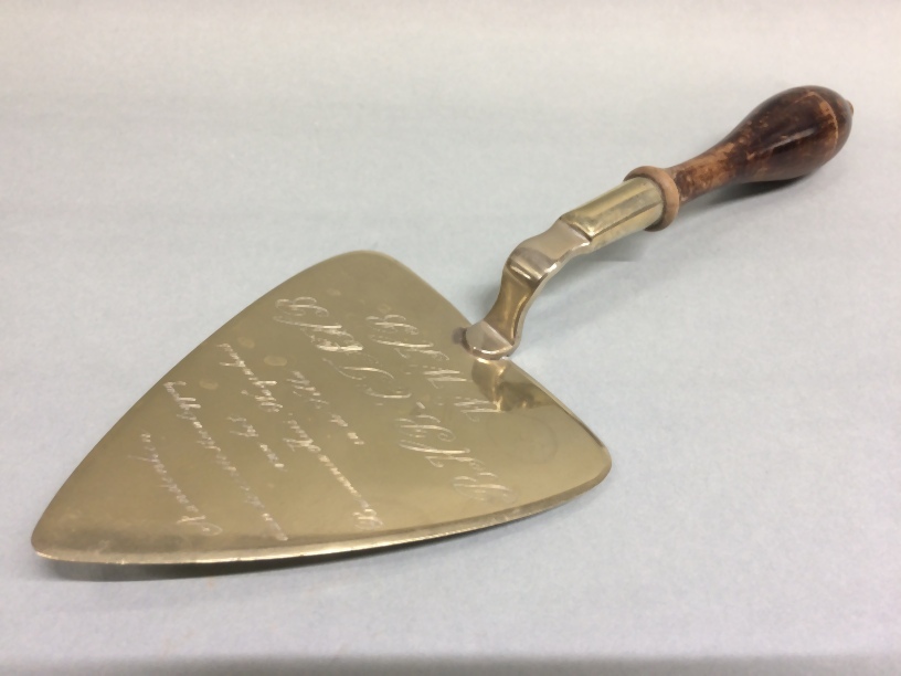Een zilveren of verzilverde troffel is het ceremonieel metselgereedschap dat wordt gebruikt bij een eerste steenlegging. Een inscriptie op het blad verhaalt over de feestelijke gebeurtenis. https://data.cultureelerfgoed.nl/term/id/cht/5c199c82-f01f-467f-a8ec-0a1216554ac6